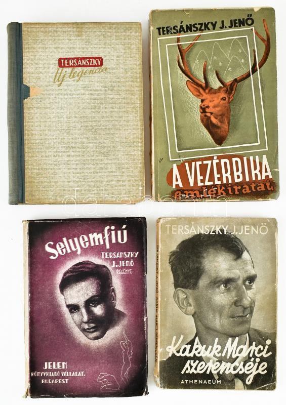 Tersánszky J. Jenő 4 műve: Új Legenda. Keresztes kiadás. Bp.,[1944],Athenaeum. Első kiadás. Kiadói kopott félvászon-kötés, kissé laza kötéssel.; Selyemfiú. Bp.,(1942),Jelen. Első kiadás. A borító Szarvas László munkája. Kiadói papírkötés, kissé kopott, kissé szakadt borítóval.; Kakuk Marci szerencséje. Bp.,(1936),Athenaeum. Első kiadás. A borítón lévő Tersánszky portré a 'foto Rubens' stúdió munkája. Kiadói papírkötés, a borító elvált a könyvtesttől és sérült.; A vezérbika emlékiratai. Bp.,1938,Cserépfalvi. Első kiadás. A borító Mihályfi Ernőné Fischer Ilona 'Filo' (1910-1986) munkája. Kiadói illusztrált papírkötés, szakadozott borítóval.
