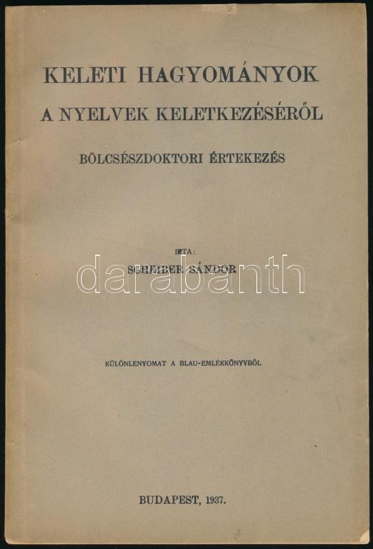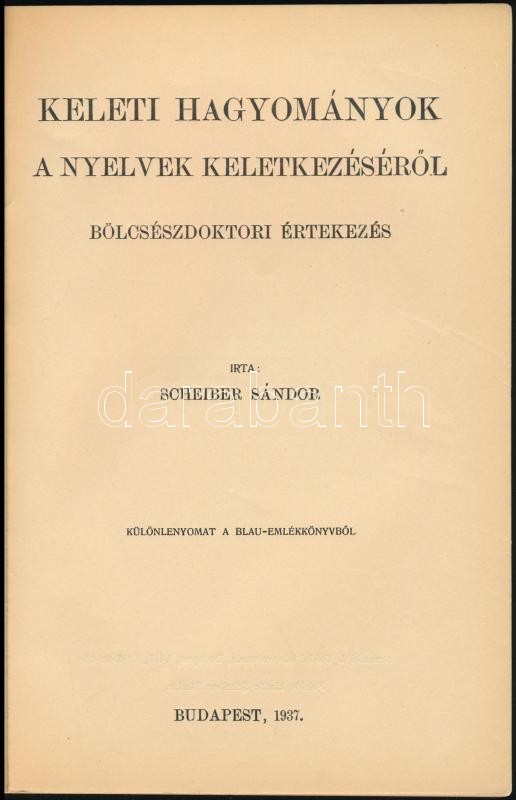 Scheiber Sándor: Keleti hagyományok a nyelvek keletkezéséről. Bölcsészdoktori értekezés. Különlenyomat a Blau-emlékkönyvből. Bp., 1937., (Neuwald I. utódai-ny.), 77+1 p. Kiadói papírkötésben, a borító egy sarkán egészen kis hiánnyal.