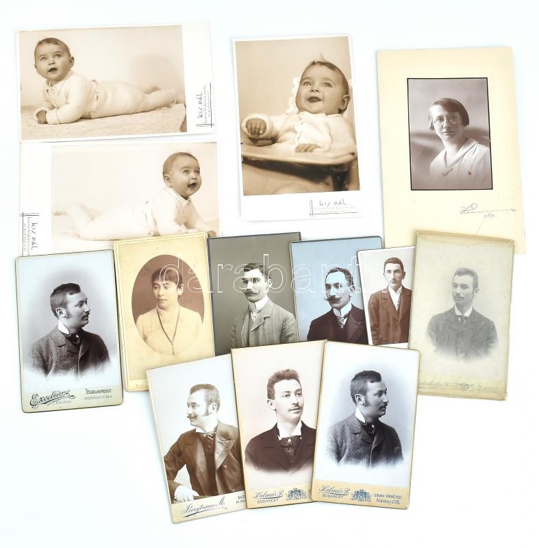 Beschreibung: cca 1900 Vegyes keményhátú fotó és fotólap tétel, közte mignon és babafotó, 13 db, 8×4,5 és 8,5×13,5 cm közötti méretekben