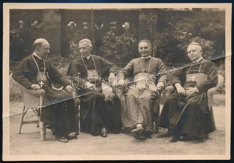cca 1920 Kohl Medárd (1859-1928) esztergomi, Rott Nándor (1869-1939) veszprémi, és Shvoy Lajos (1879-1968) székesfehérvári püspök Lorenzo Schioppa (1871-1935) nuncius, pápai követ társaságában, hátoldalán feliratozott fotó, közepén töréssel, 16,5x11,5 cm