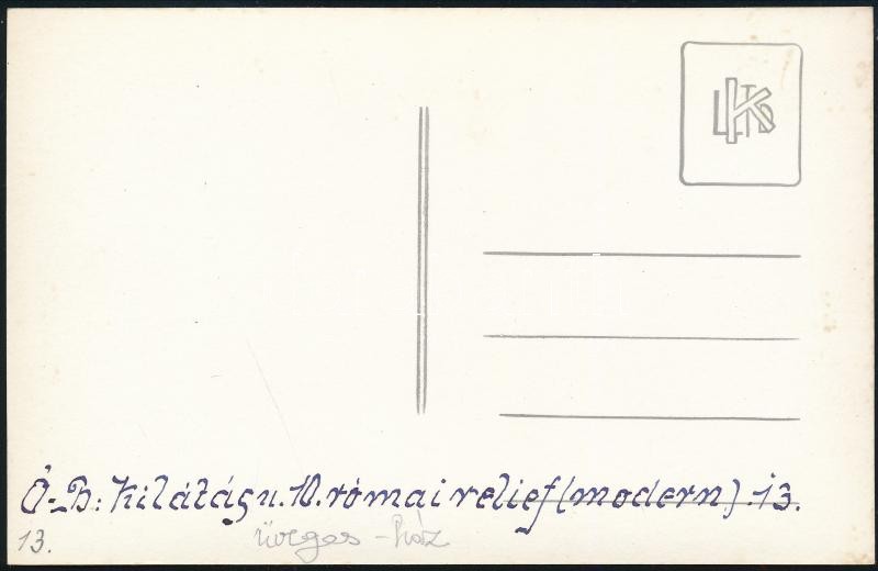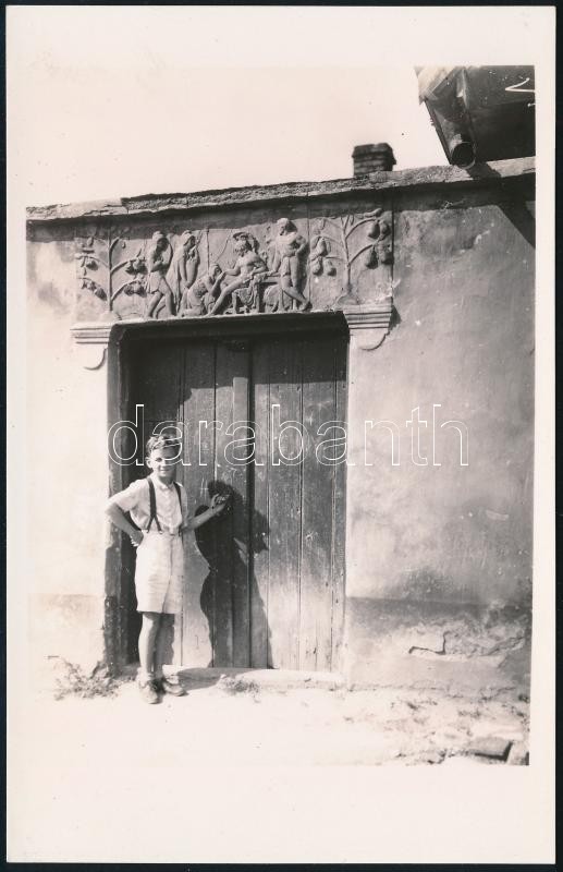 cca 1930 Budapest, az Óbudai Kilátás utca 10. sz., üvegesműhelyként is működő ház kapubejárata feletti modern római relief, hátoldalon feliratozott fotó, szép állapotban, 14×9 cm