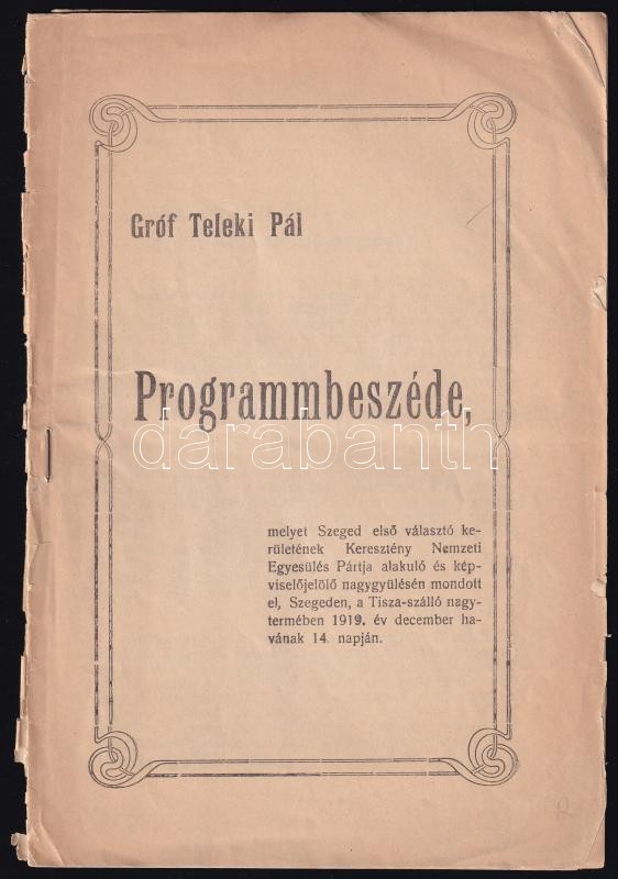 1919 Gróf Teleki Pál programbeszéde, széteső állapotban, 17p https://www.darabanth.com/de/405-Fernauktion/405.0/Kunst-Dokumente-andere-Sammelgebiete/Drucksachen~32/1919-Grof-Teleki-Pal-programbeszede-szeteso-allapotban-17p~II2501770