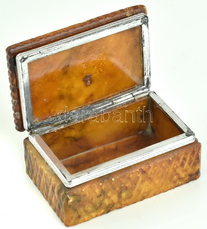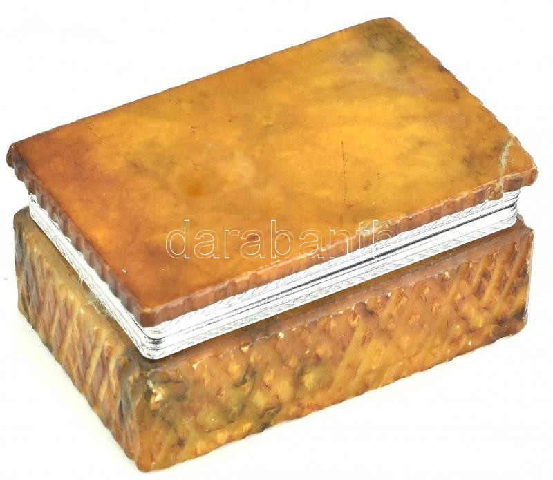 Borostyán színű alabástrom dobozka, fém zsanérral, sérülésekkel, 11x7x... https://www.darabanth.com/de/405-Fernauktion/405.0/Kunst-Dokumente-andere-Sammelgebiete/Flohmarkt~12/Borostyan-szinu-alabastrom-dobozka-fem-zsanerral-serulesekkel-11x7x5cm~II2499956