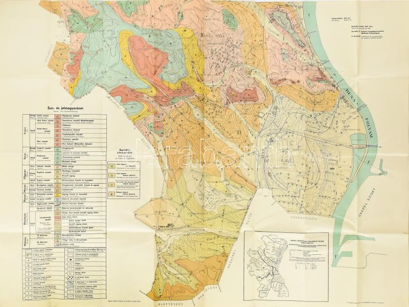 1938 Budapest székesfőváros dunajobbparti részének térképe (Déli rész). Hidrológiai Közlöny XVIII. kötet, Horusitzky H.: Budapest dunajobbparti részének (Budának) hidrogeológiája nagyméretű térképmelléklete. Rajzolták: Garami T., Pálfalvi Gy. és Zuna A., Klösz György és Fia Térképészeti Műintézet Bp., 122x91 cm