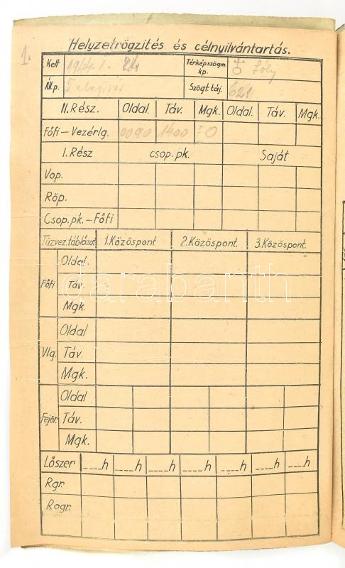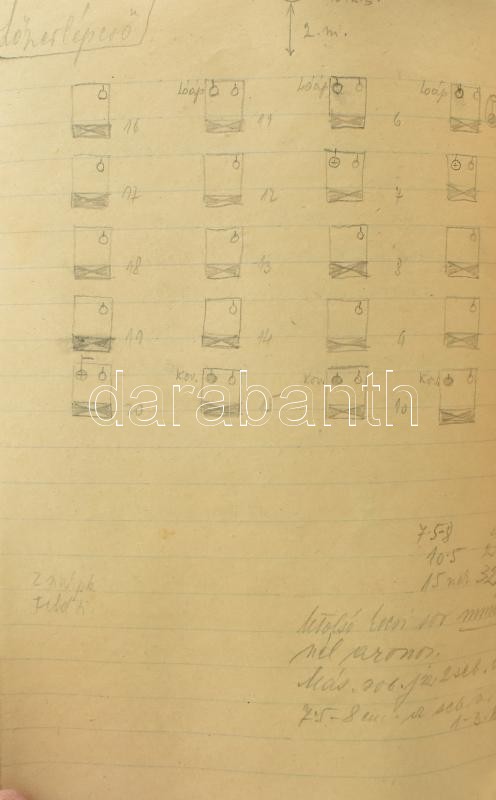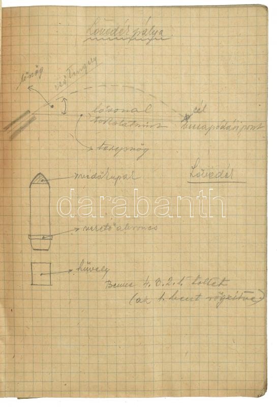 1943 A M. Kir. Bercsényi Miklós 2. honvéd tüzérosztag karpaszományos iskolába járó dr. Laban János karpaszományos őrvezető 9 db jegyzetfüzete + 2 db táblázatos nyomtatványfüzet (ütegparancsnoki és elsőtiszti előjegyzés), 1 db Általános Újonckiképzési Tervezetkönyv (106p), továbbá egyéb kézzel írt és stencilezett jegyzetek, vizsgakérdések változatos témában, rendkívül érdekes anyag