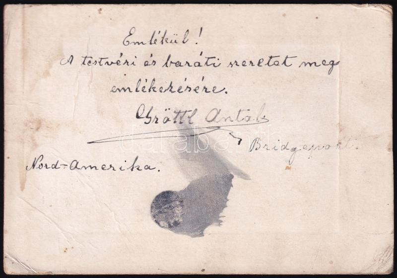 Beschreibung: cca 1910 Huszár portréja, kartonra ragasztott fotó, hátoldalon feliratozva, észak-amerikai helymegjelöléssel, felületén apró foltok, 9,5×6 cm