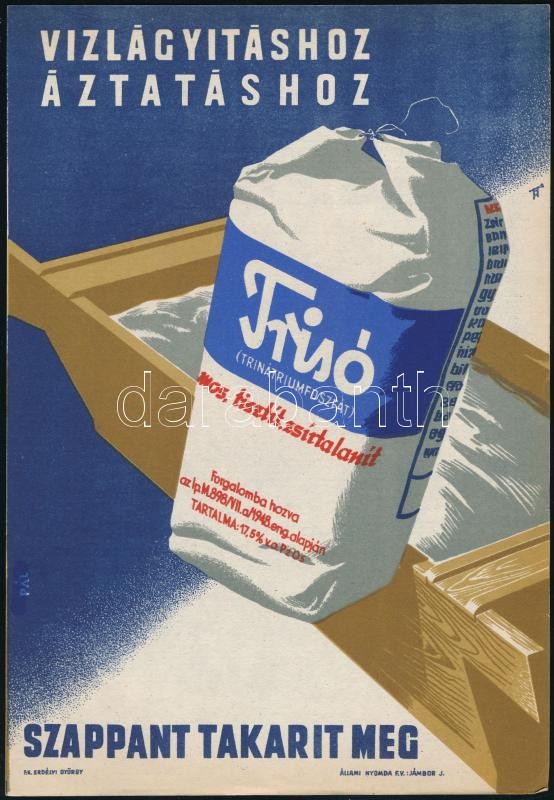 1958 Villamosplakát: Vízlágyításhoz, áztatáshoz Trisó, gr: Gábor Pál, ... https://www.darabanth.com/de/405-Fernauktion/405.0/Kunst-Dokumente-andere-Sammelgebiete/Plakat~33/1958-Villamosplakat-Vizlagyitashoz-aztatashoz-Triso-gr-Gabor-Pal-23-5C39716-5-cm~II2503371