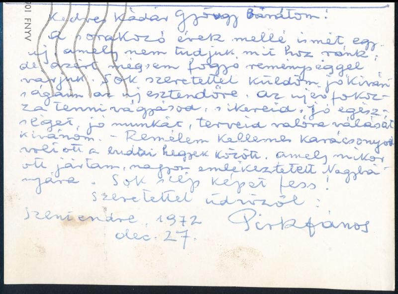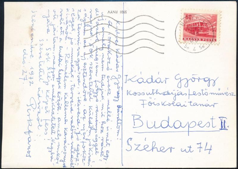 Beschreibung: 1972 Pirk János (1903-1989) festő, grafikus autográf aláírása és sorai Kádár György (1912-2002) festőművész részére, megírt, futott képeslapon