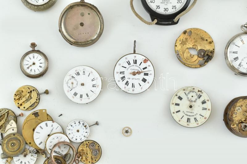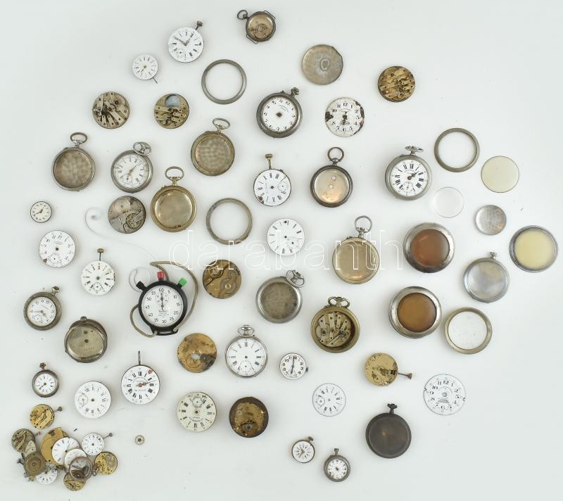 Beschreibung: Nagy órás tétel: számlapok, zománc és porcelán, zsebóra szerkezetek, tokok, mind régiek, hozzá egy modern működő stopper