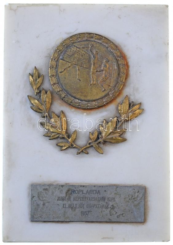 Szentesy Hiesz Géza (1896-1975) 1957. "Röplabda - Magyar Népköztársasági Kupa II. hely női csapatának 1957" aranyozott Br díjérem (50mm) táblával, márvány alapon (157x119mm)