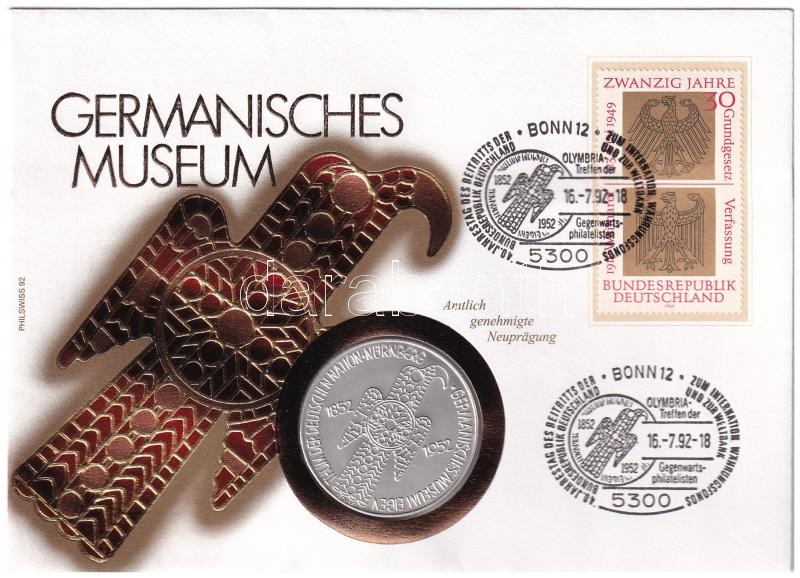 Németország 1992. "Német Nemzeti Múzeum Nürnberg 1852-1952" Ag emlékérem felbélyegzett "Német Múzeum" borítékban, német nyelvű ismeretővel (1oz/0.999) T:BU patina Germany 1992. "German National Museum Nuremberg 1852-1952" Ag commemorative coin in envelope "German Musem" with stamp and information in German (1oz/0.999) C:BU patina