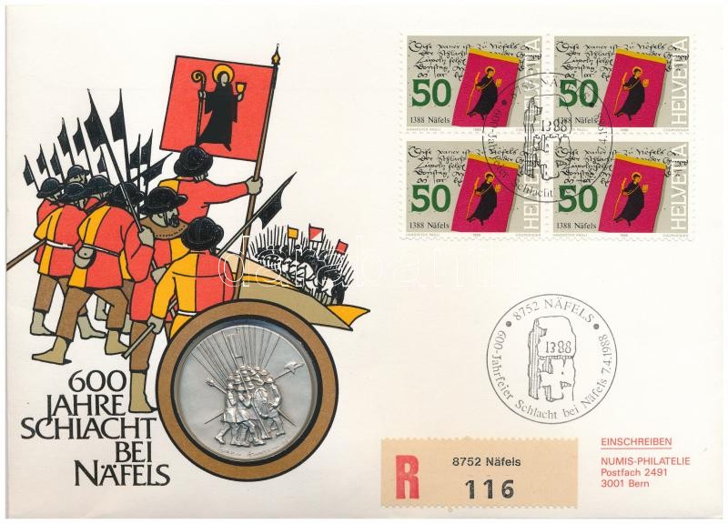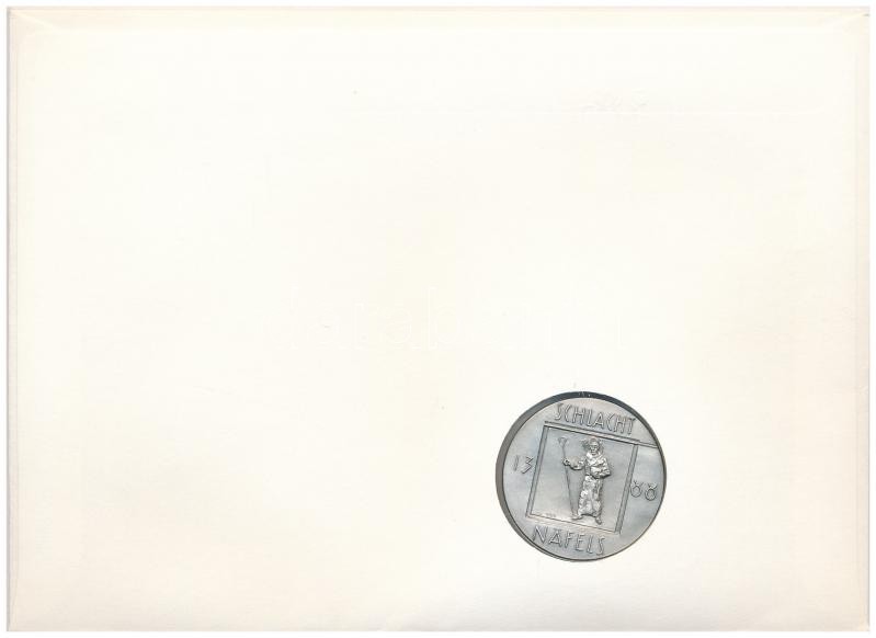 Svájc 1988. "Näfelsi csata 600. évfordulója" jelzett Ag emlékérem érmés borítékban, bélyeggel, alkalmi bélyegzéssel, német nyelvű leírással (0.999) T:1 Switzerland 1988. 600th Anniversary of the Battle of Näfels" hallmarked Ag commemorative medallion in envelope with stamp, with German description (0.999) C:UNC