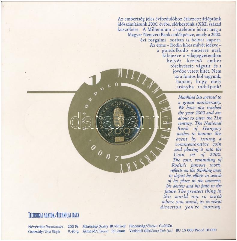 2000. 1Ft-100Ft (7xklf) forgalmi sor szettben + "200Ft Millenium&... https://www.darabanth.com/de/405-Fernauktion/405.0/Numismatik/Ungarische-Munzen-und-Munzen-mit-ungarischem-Munzzeichen~1500008/2000-1Ft-100Ft-7xklf-forgalmi-sor-szettben-plus-200Ft-Millenium-TPP-patina-a-kulso-tok-hianyz~II2504905