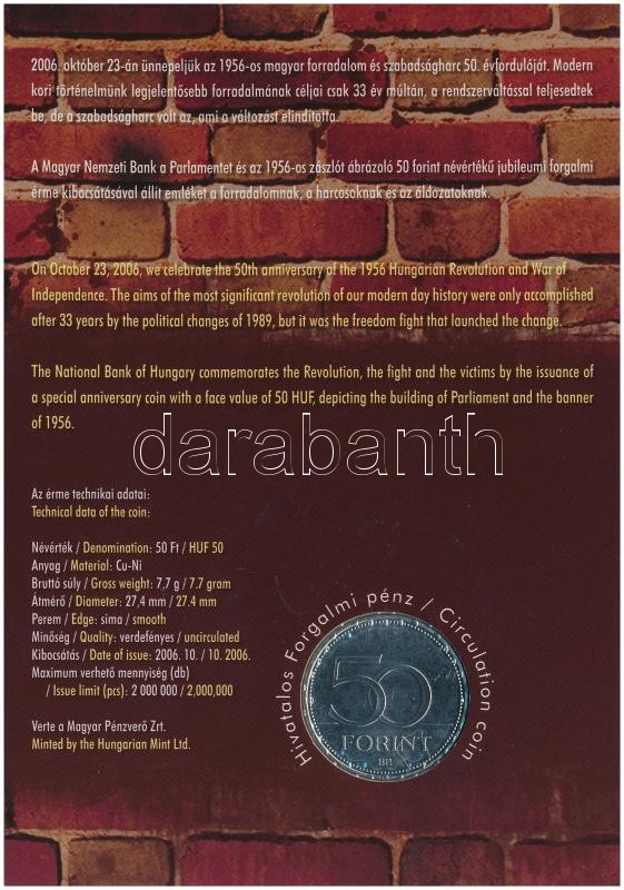 2006. 50Ft Cu-Ni "1956-os forradalom" emléklapon T:1 https://www.darabanth.com/de/405-Fernauktion/405.0/Numismatik/Ungarische-Munzen-und-Munzen-mit-ungarischem-Munzzeichen~1500008/2006-50Ft-Cu-Ni-1956-os-forradalom-emleklapon-T1~II2505148
