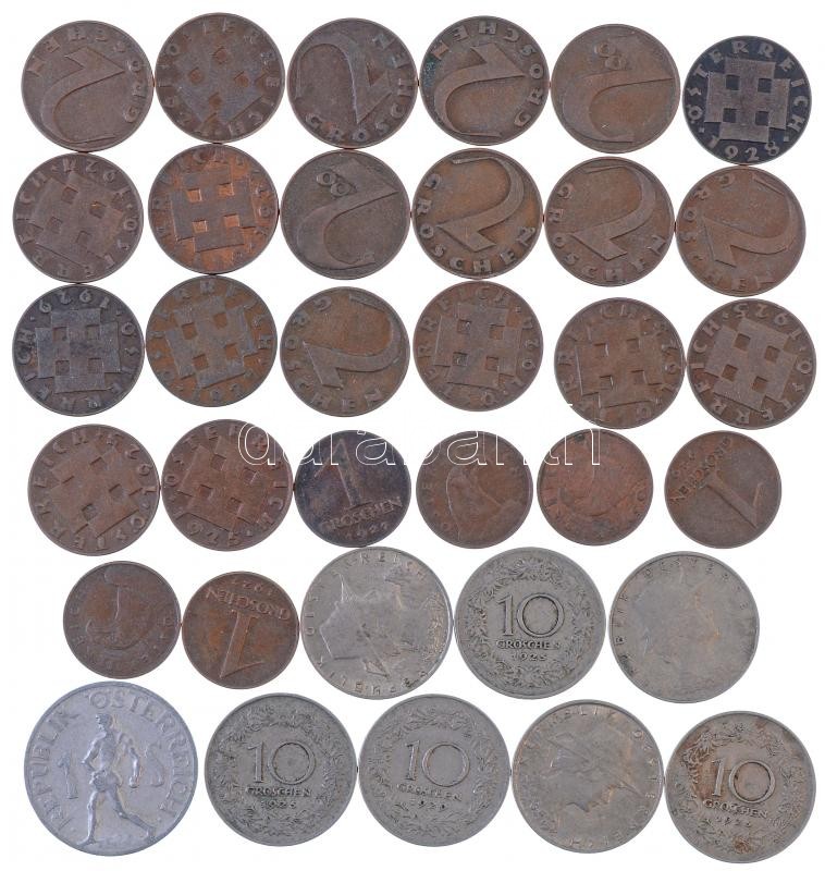 Austria 1924. 100 Kronen Br (2pcs) + 1924. 200 Kronen Br (5pcs) + 1924. 1000 Kronen + 1925-1929. 1 Groschen Br (4pcs, 3xdiff) + 1925-1937. 2 Groschen Br (15pcs, 6xdiff) + 1925-1929. 10 Groschen Cu-Ni (6pcs, 2xdiff) + 1952. 1 Schilling Al C:XF-F