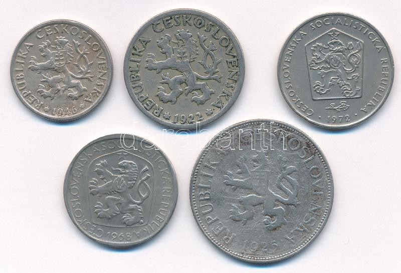 Csehszlovákia 1922. 1K Cu-Ni + 1925. 5K Cu-Ni 1946. 1K Cu-Ni + 1968. 3... https://www.darabanth.com/de/405-Fernauktion/405.0/Numismatik/Weltweit-Munzen~1500014/Csehszlovakia-1922-1K-Cu-Ni-plus-1925-5K-Cu-Ni-1946-1K-Cu-Ni-plus-1968-3K-Cu-Ni-plus-1972-2K-Cu-Ni-T2-~II2502114