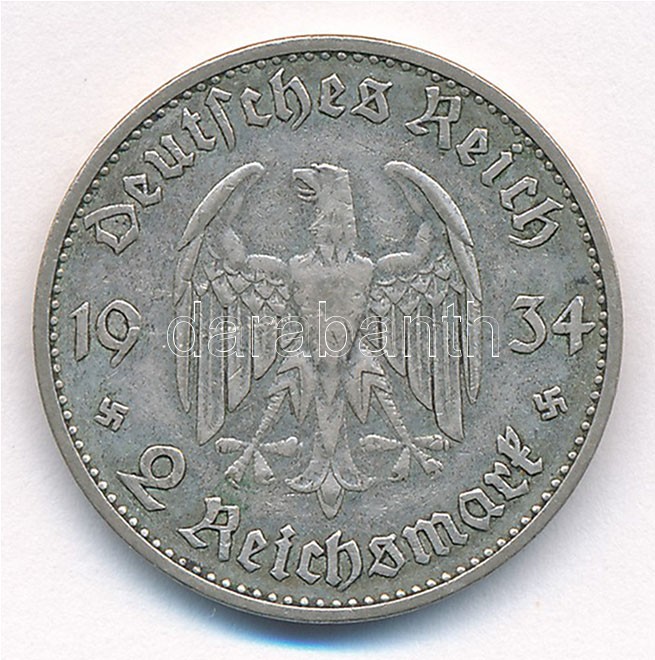 German Third Reich 1934A 2 Marks Ag "1st Anniversary of Nazi rule March 21, 1933 - Garnisonkirche" C:XF,VF