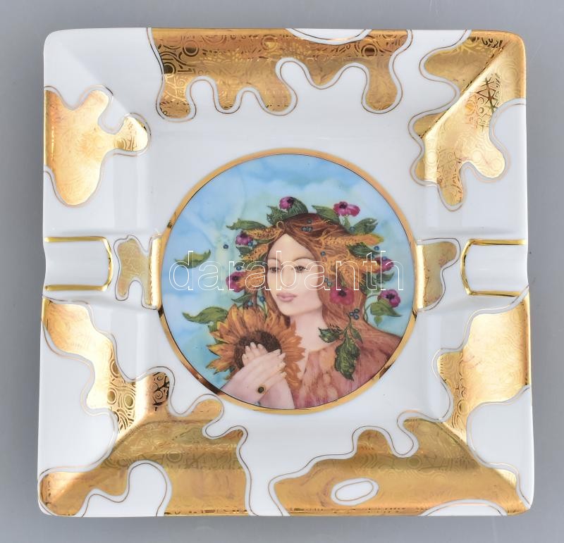 Hollóházi Faragó Miklós (1947- ) által tervezett porcelán készlet (váza, hamutál, bonbonniere) díszdobozban. Vivaldi A négy évszak - Tavasz dekorral. Limitált szériás Kézzel sorszámozott 1999/1430. számmal. levonóképes, aranyozott, jelzett, hibátlan. 36 cm, 17x17 cm 13 cm