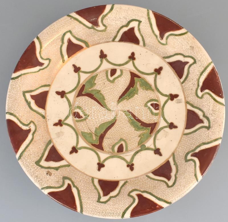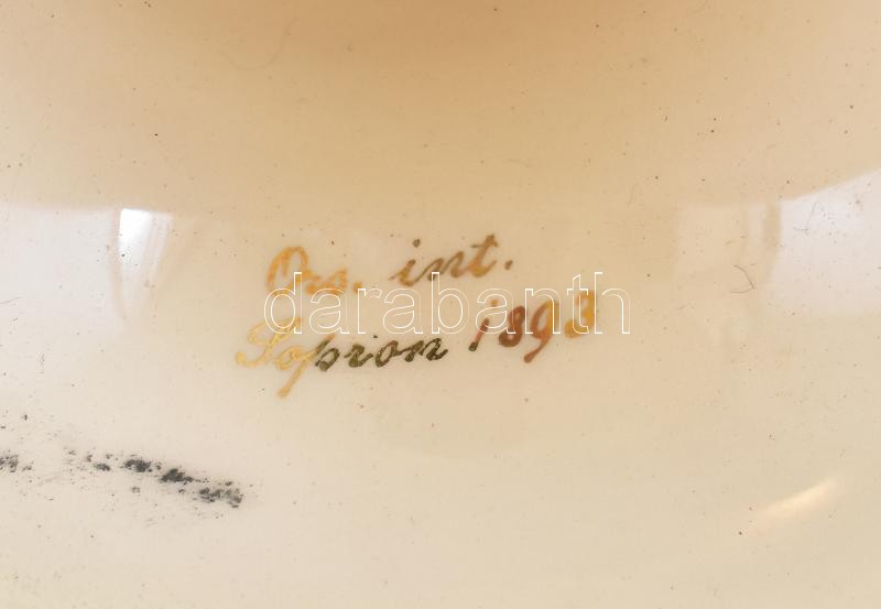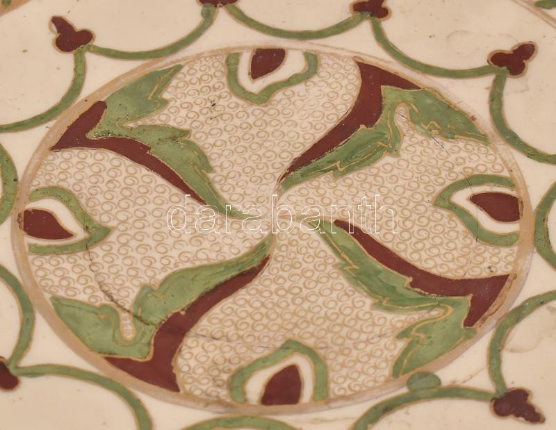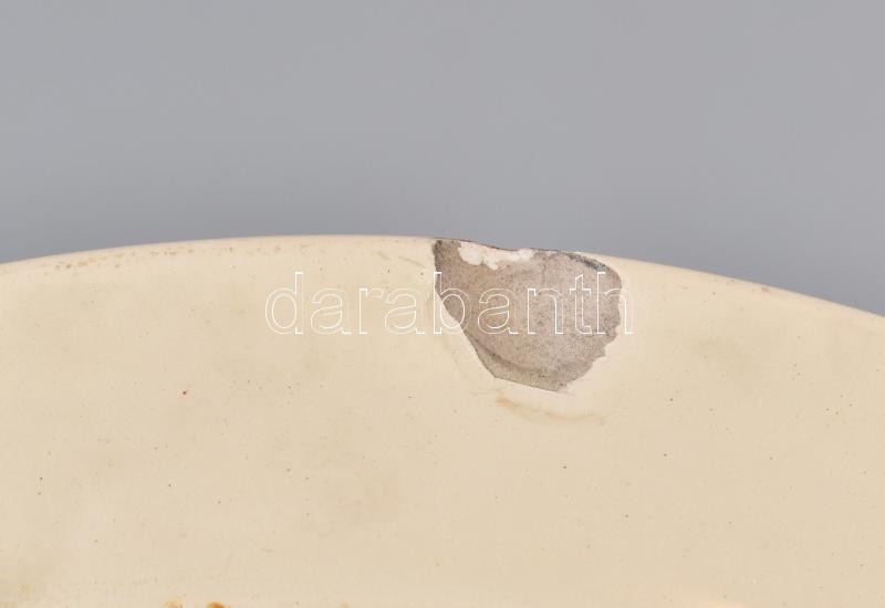 Beschreibung: Schütz Cilli talpas tortatál. Kézzel festett fajansz. Jelzett: masszába nyomott: Schütz Cilli és máz feletti arannyal: Sopron 1893. Csorbák, repedéssel, karcolások. m: 12cm, d: 30cm