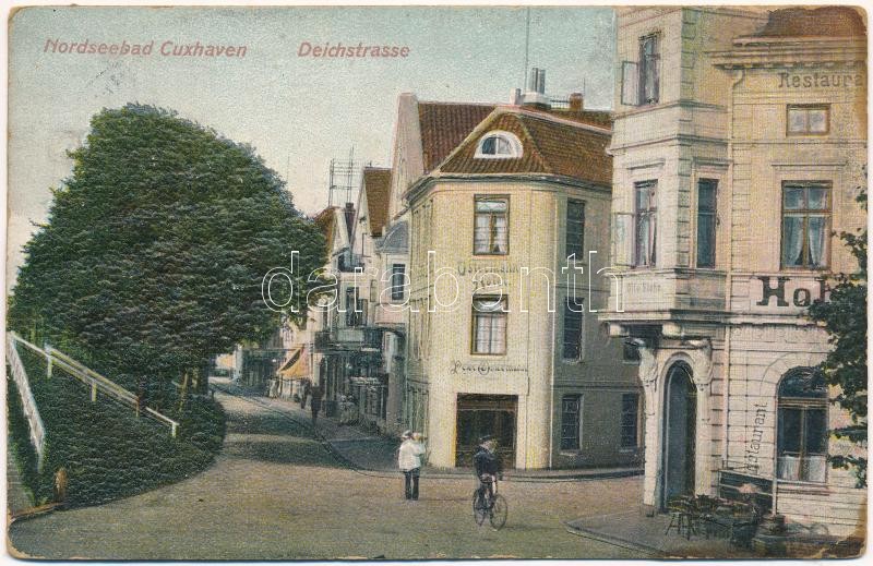Beschreibung: Cuxhaven, Deichstrasse / street view, Ostermann's Hotel, restaurant, bicycle. A. Baumeister Emb. (r)