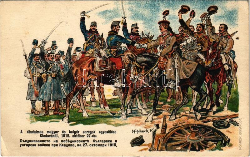 A diadalmas magyar és bolgár seregek egyesülése Kladovónál. Testvéri üdvözletét küldi a vitéz bolgár nemzetnek Magyarországból... a bolgár vöröskereszt javára / WWI Austro-Hungarian K.u.K. military, troops of Bulgaria and Austria-Hungary reunite by Kladovo. Charity card for the Bulgarian Red Cross. litho s: Mühlbeck K. (EK)