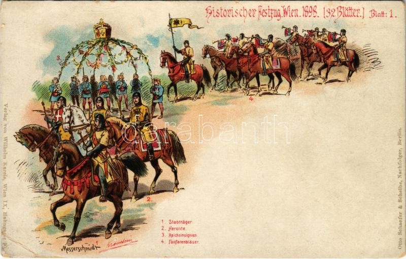 Beschreibung: Historischer Festzug Wien 1898. (32 Blätter) Blatt 1. Stabträger, Herolde, Reichsinsignien, Fanfarenbläser. Verlag v. Wilhelm Kareis. Otto Schaefer & Scheibe litho s: Messerschmidt (EK)