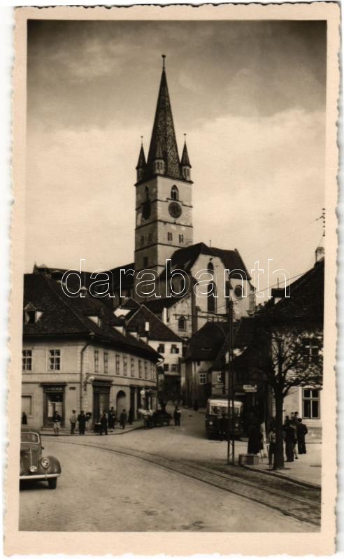 Nagyszeben, Hermannstadt, Sibiu; Evangélikus templom az alsó városrészből nézve, utca, Schob üzlete, autó, autóbusz a buszmegállóban / Lutheran church, street, shop, automobile, bus at the stop. photo (non PC)