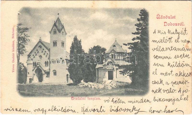 Beschreibung: 1901 Doboz, Uradalmi templom. Véver Oszkár kiadása (lyuk / hole)