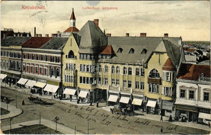 1915 Kecskemét, Lutheránus bérpalota, Fekete Soma, Fehér Dávid, Fleischer K. Fia, Kemény Izidor, Csapó Lajos, Fleischer Kálmán, Sasvári Böske üzlete, Néptakarékpénztár, drogéria. Szél Nándor kiadása (EK)