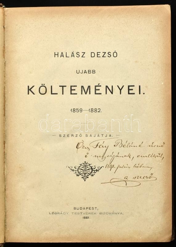Halász Dezső: Ujabb költeményei I. 1859-1882. Bp., 1882, Légrády Testvérek Bizománya, 348 p. Korabeli dombornyomott egészvászon-kötés, márványozott lapélekkel, kissé sérült, kopott borítóval és gerinccel, helyenként kissé foltos lapokkal. A szerző által DEDIKÁLT pédány.