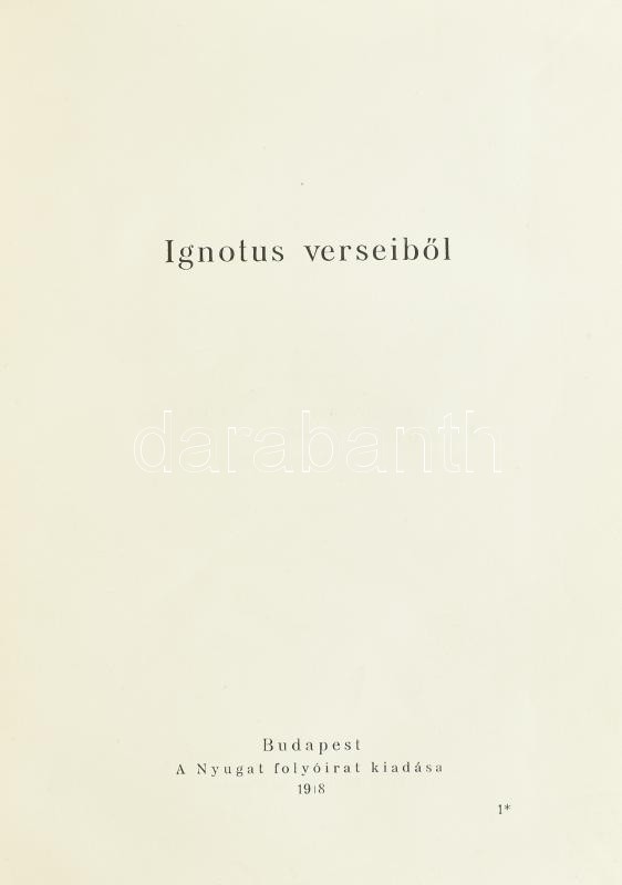 Ignotus verseiből, Budapest, 1918 Nyugat folyóirat kiadása 116p. 150. számozott példányban is megjelent, ez számozatlan kiadói kissé sérült vászonkötésben