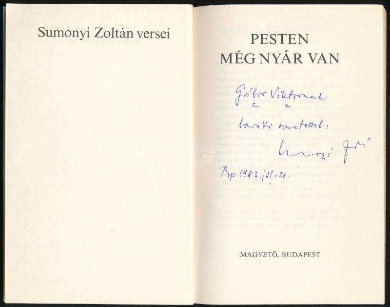 A szerző, Sumonyi Zoltán (1942-) által Gábor Viktor, a Kulturális Minisztérium Kiadói Főigazgatóságának vezetője részére részére dedikált példány.