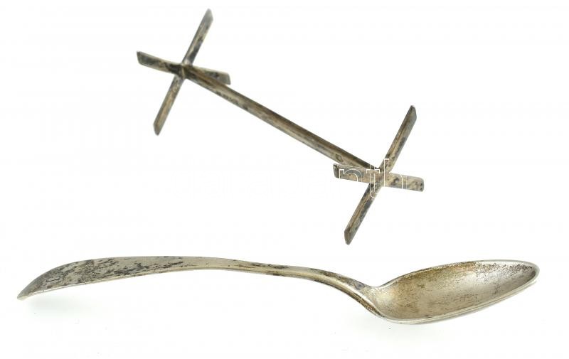 Ezüst (Ag) Kanál és késbak, jelzett, h: 14 és 9 cm, nettó: 36g https://www.darabanth.com/de/406-Fernauktion/406.0/Juwelen/Juwelen~1000001/Ezust-Ag-Kanal-es-kesbak-jelzett-h-14-es-9-cm-netto-36g~II2507532