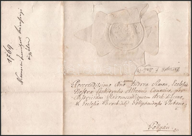 Beschreibung: 1769 Katonai személyek házassági ügyében kelt hivatalos levél Nagyszebenből Pollyára, papírfelzetes viaszpecséttel