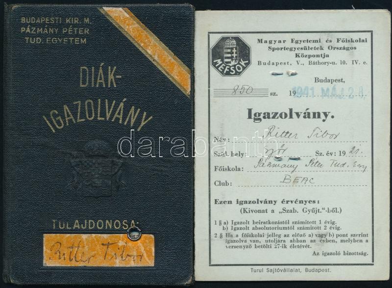 Beschreibung: 1939-1942 Kir. M. Pázmány Péter Egyetem által kiállított fényképes diákigazolvány + MEFSOK fényképes sportigazolvány