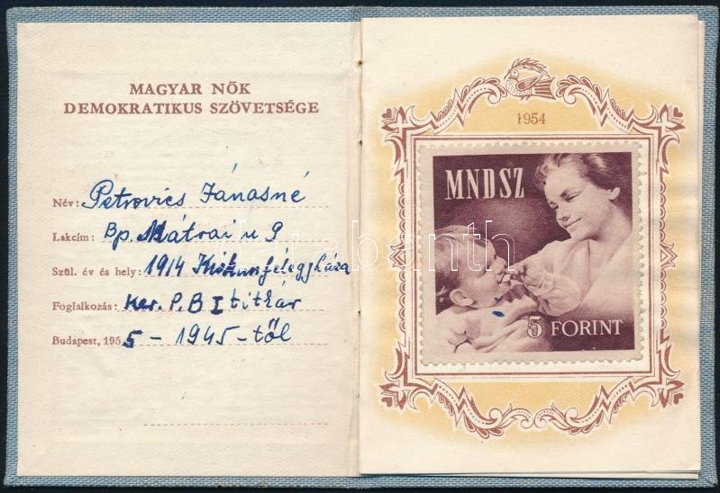 1955 Magyar Nők Demokratikus Szövetsége (MNDSZ) tagsági könyv Petrovic... https://www.darabanth.com/de/406-Fernauktion/406.0/Kunst-Dokumente-andere-Sammelgebiete/Dokument~500018/1955-Magyar-Nok-Demokratikus-Szovetsege-MNDSZ-tagsagi-konyv-Petrovics-Janosne-I-keruleti-~II2510175