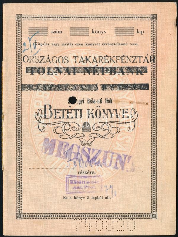cca 1950-1960 Országos Takarékpénztár (Tolnai Népbank Rt.) betéti köny... https://www.darabanth.com/de/406-Fernauktion/406.0/Kunst-Dokumente-andere-Sammelgebiete/Dokument~500018/cca-1950-1960-Orszagos-Takarekpenztar-Tolnai-Nepbank-Rt-beteti-konyve-lyukasztassal~II2511987