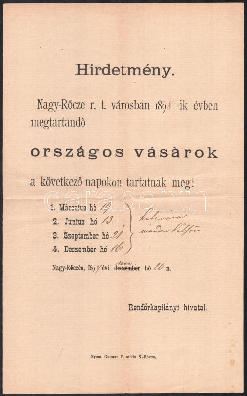 1897 Nagyrőce, az 1898. évben tartandó országos vásárokról szóló hirde... https://www.darabanth.com/de/406-Fernauktion/406.0/Kunst-Dokumente-andere-Sammelgebiete/Drucksachen~2500002/1897-Nagyroce-az-1898-evben-tartando-orszagos-vasarokrol-szolo-hirdetmeny-levelkent-p~II2510201