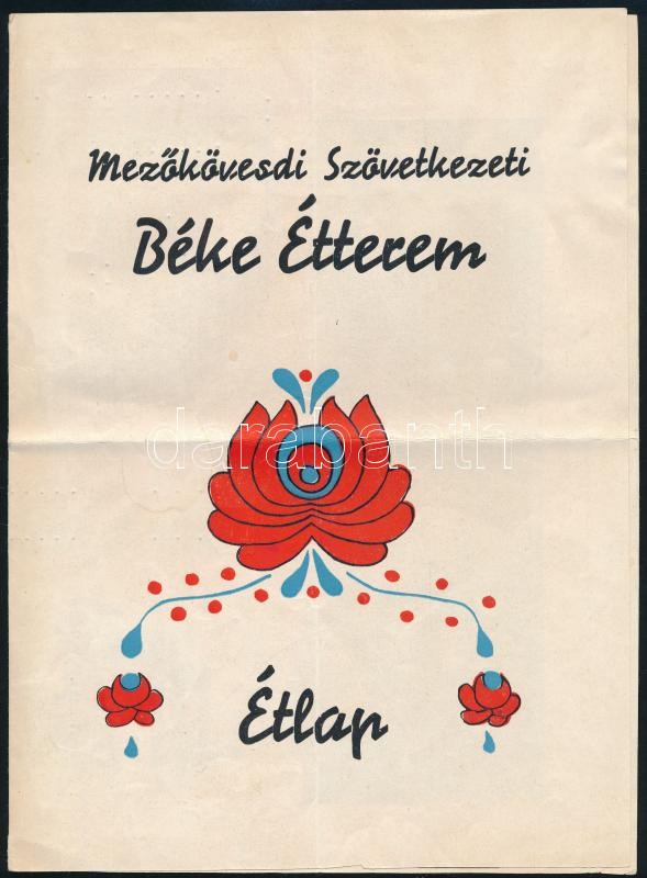 1961 Mezőkövesdi Szövetkezeti Béke Étterem étlapja, hajtott https://www.darabanth.com/de/406-Fernauktion/406.0/Kunst-Dokumente-andere-Sammelgebiete/Drucksachen~2500002/1961-Mezokovesdi-Szovetkezeti-Beke-Etterem-etlapja-hajtott~II2507919