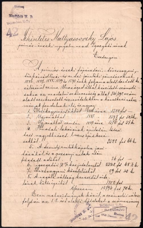 Beschreibung: 1893 Tekintetes Mattyasovszky Lajos prímás érseki urad. igazgatónak szóló levél Simor János hercegprímás örököseitől elszámolási kérdésekben