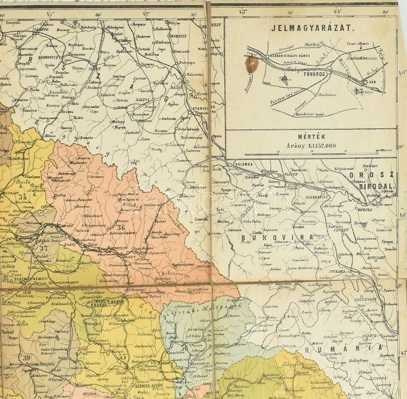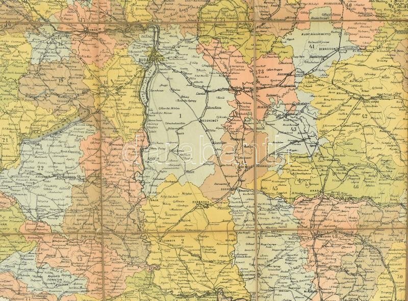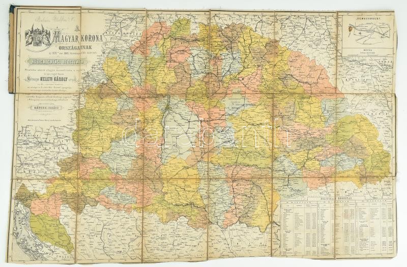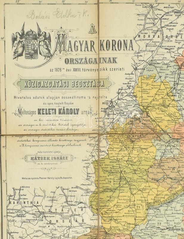 A magyar korona országainak az 1876ik XXXIII. törvényczikk szerinti közigazgatási beosztása. mélt Keleti Károly urnak m. kir. miniszteri tanácsos úrnak... mély tisztelettel ajánlja Hátsek Ignác térképész Vászonra kasírozva, szélei vágottak., 85x60 cm Kiadói sérült papírborítóval. Litográfia