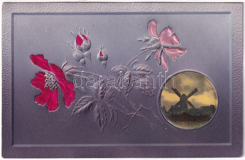 Beschreibung: 1905 Art Nouveau Emb. Greeting card with silk flowers and windmill