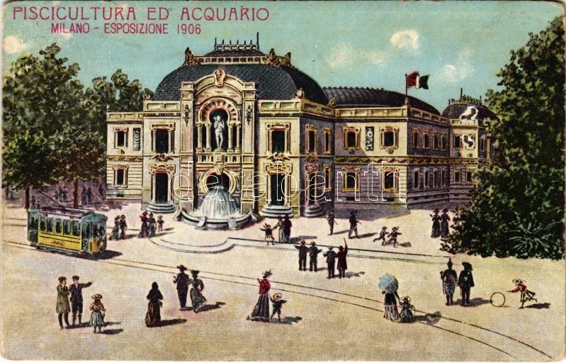 Beschreibung: Milano, Milan; Piscicultura ed Acquario, Milano Espozione 1906 / Milan International Expo, Civic Aquarium, tram (worn corners)