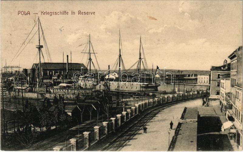 1913 Kriegsschiffe in Reserve. K.u.K. Kriegsmarine / Navi in Riserva / Osztrák-Magyar Haditengerészet csatahajói Polában a tartalékkikötőben / Austro-Hungarian Navy battleships in the reserve dock near the Pula shipyard. Phot. J. Révész