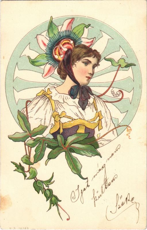 1900 Art Nouveau lady, litho (fl) https://www.darabanth.com/de/407-Fernauktion/407.0/Ansichtskarten/Kunstlerkarten~1000069/1900-Art-Nouveau-lady-litho-fl~II2431331