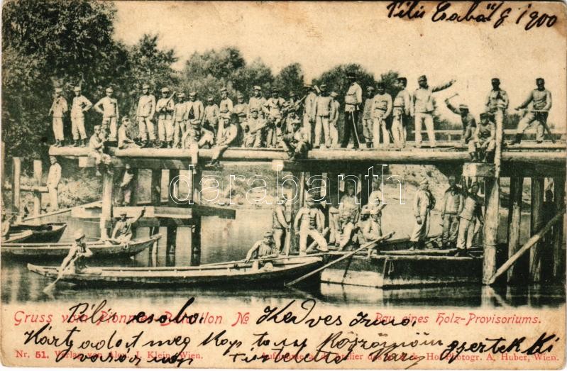 Beschreibung: 1900 Bau eines Holz-Provisoriums. Gruss vom Pionnier-Bataillon No. / Austro-Hungarian K.u.K. military, pioneers building a temporary bridge (EK)
