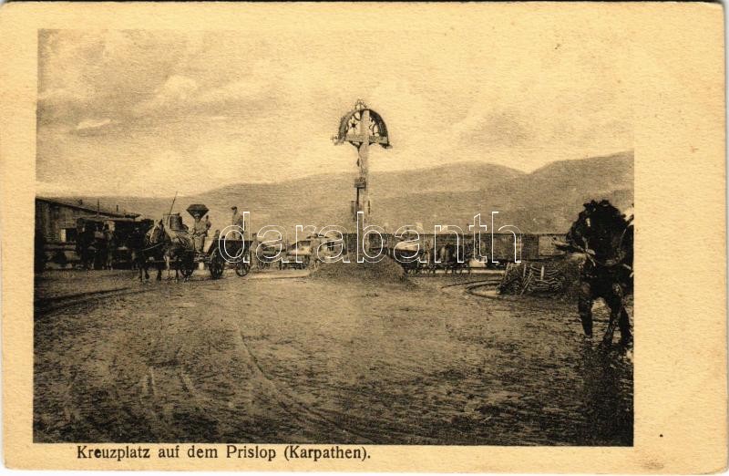 Kreuzplatz auf dem Prislop (Karpathen). Prislopbahn. Feldbuchhandlung der 1. Inf.-Dev. / Első világháborús osztrák-magyar vasútállomás a Borsa-Priszlop-Jakobeny keskeny nyomtávolságú gőzüzemű tábori vasútvonalon az erdélyi hegyekben / WWI K.u.K. military railway station of the Borsa-Prislop-Iacobeni narrow gauge steam powered field railroad in the Transylvanian mountains
