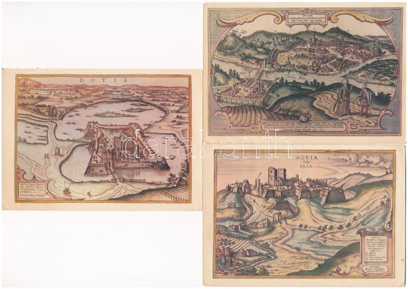 5 db MODERN magyar város képeslap: anno 1617 és 1657 - Képzőművészeti Alap Kiadóvállalat + 15 budapesti mini kártya / 5 MODERN Hungarian town-view postcards: general view anno 1617 and 1657 + 15 mini Budapest cards