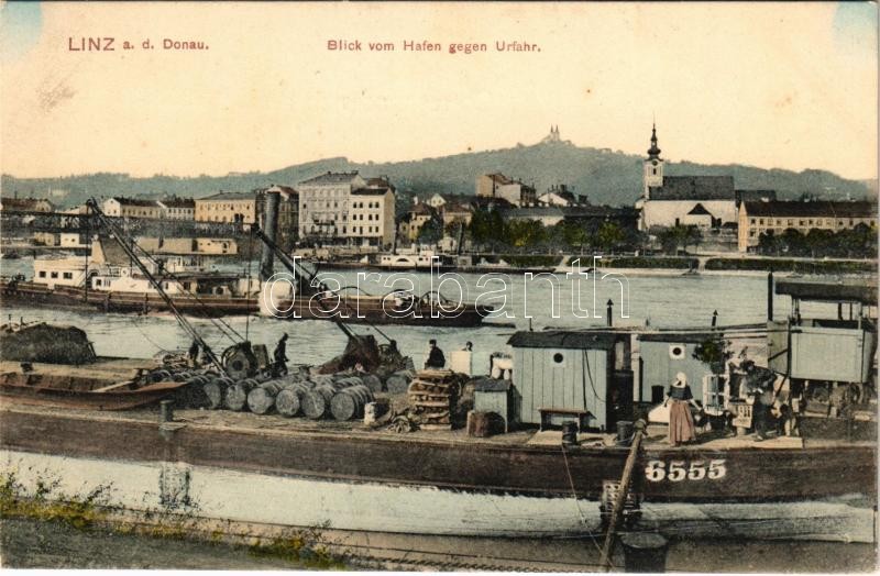 Linz, Blick vom Hafen gegen Urfahr / harbor, steamship, barge https://www.darabanth.com/de/407-Fernauktion/407.0/Ansichtskarten/Osterreich~1000018/Linz-Blick-vom-Hafen-gegen-Urfahr-harbor-steamship-barge~II2517445