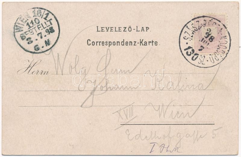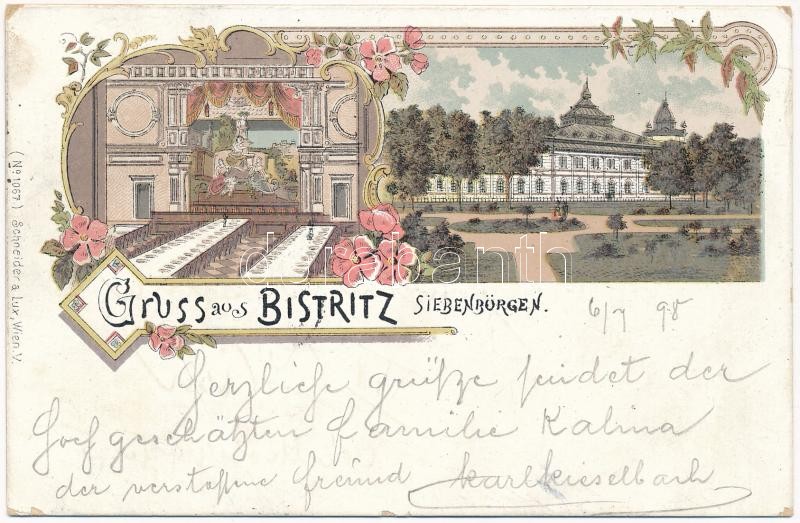 1898 (Vorläufer) Beszterce, Bistritz, Bistrita; Iparosegyeleti ház, étkező, belső / Gewerbeverein / House of Craftsmen Association, dining room, interior. Schneider & Lux No. 1067. Art Nouveau, floral, litho + "SZÁSZRÉGEN-KOCSÁRD 130. SZ. " vasúti mozgóposta (EK)